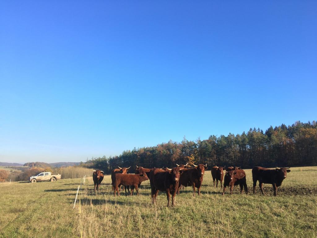 Krávy chováme na maso, i když hlavně pro potěšení. Ovce a kozy nás živí pastvou v nedaleké CHKO Český kras. Od jara do podzimu je přeháníme se psem, stavíme ohrady, vozíme vodu, klučíme pastviny od křoví. Říkají tomu pastevní management. Je to ohromná zábava, protože nejde o obyčejné louky, ale malá, často tajná místa plná strmých svahů, skalisek a zakroucených doubrav. První pastevci tu se svými stády pobývali před 6000 lety, spali v jeskyních a nepotřebovali žádné dotace. Dneska je doba trochu jiná, ale to nám nebrání rozdělat si občas oheň a připadat si jako neolitický pasáček.